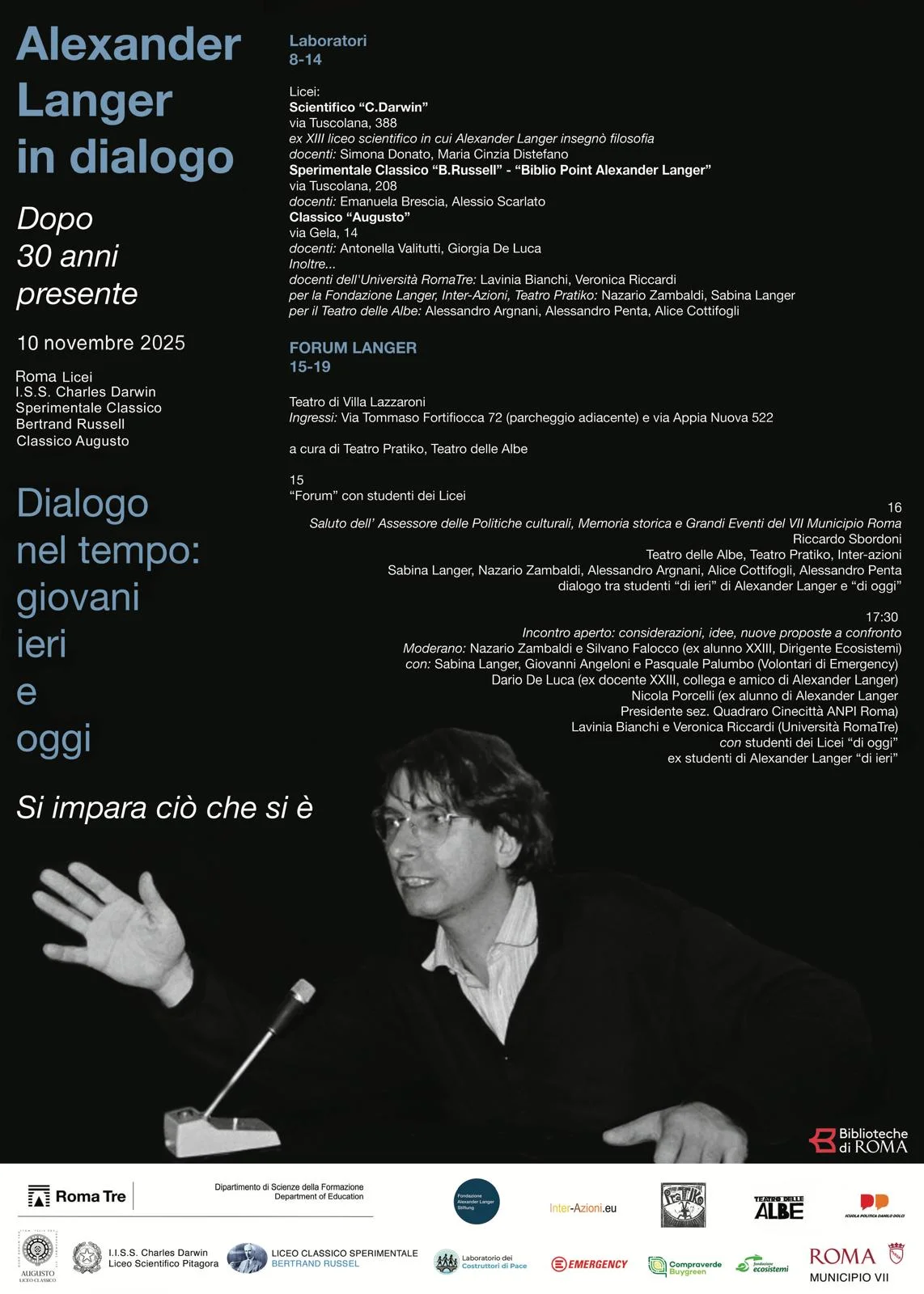 L’attività laboratoriale degli studenti nelle scuole sui temi “langeriani”, incontra al mattino un progetto che mette in collegamento la ricorrenza dei trent’anni dalla morte di Langer con gli ottant’anni dalla nascita l’anno prossimo: il Forum Langer con Teatro Pratiko e Teatro delle Albe insieme a Inter-Azioni percorso di cittadinanza europea nelle scuole accoglie le voci di studenti accompagnati da insegnanti a riscoprire pensieri, parole e azioni di Alexander Langer, insieme a studenti che lo hanno conosciuto e sono stati suoi allievi. Questa occasione di teatro comunitario porterà anche a una produzione teatrale vera e propria che intende farsi sintesi del messaggio riflesso dalle giovani generazioni, nell’oggi. Il pomeriggio le attività si sposteranno nel locale del Teatro di Villa Lazzaroni in Via Appia Nuova 522, e, oltre al confronto tra i ragazzi dei tre licei e il lavoro teatrale, vedranno un incontro ‘aperto’ al confronto, riflessioni, contributi tra tutti i partecipanti. La giornata ha il Patrocinio del Municipio VII, rappresentato nell’occasione dall’Assessore alle Politiche Culturali.
