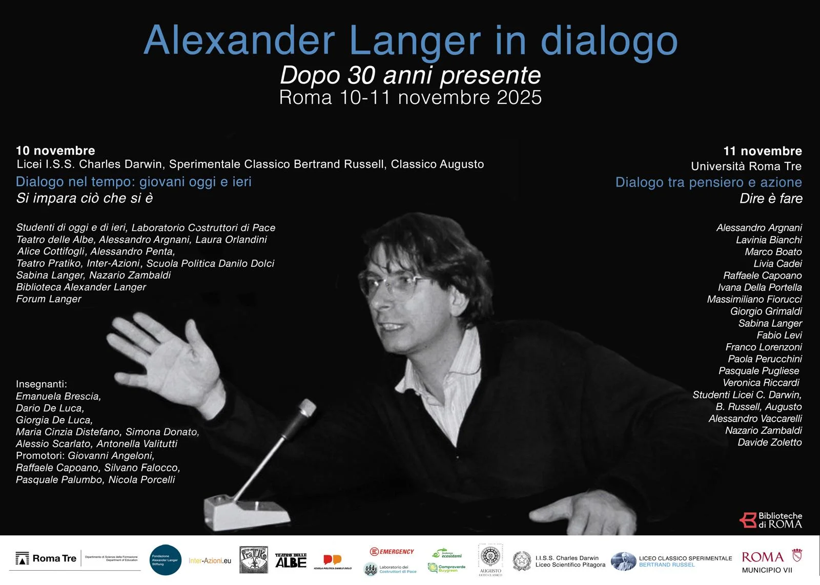 Roma 10-11 novembre 2025. Le giornate “Alexander Langer in dialogo” nascono dall’idea di un gruppo di suoi allievi, ex studenti del liceo di Roma dove Alexander Langer insegnò filosofia e dal lavoro del gruppo promotore con docenti dell’università Roma Tre, da persone attive nella Fondazione Alexander Langer Stiftung, con la collaborazione di insegnanti e organi scolastici dei Licei della zona Appio-Tuscolano. L’obiettivo condiviso è, in questa cornice “giovane” di Università e Licei, di far emergere ed evidenziare la vitalità e l’attualità del pensiero di Alex Langer attraverso testimonianze e esperienze concrete a trent’anni dalla morte.