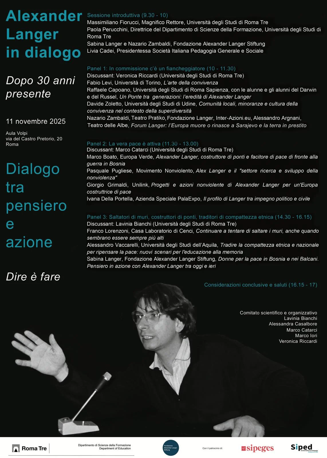 La seconda giornata – Dialogo tra pensiero e azione - Dire è fare – è un convegno organizzato dall’università Roma Tre, con il patrocinio della Società italiana di Pedagogia Generale e Sociale (SIPeGeS) e la Società Italiana di Pegagogia – SIPED in collaborazione con la Fondazione Alexander Langer Stiftung. Testimoni e amici, amiche di Langer si alterneranno a voci su esperienze che ne declinano l’eredità, con particolare attenzione al ricordo di un Langer insegnante, al messaggio di pace e convivenza, al necessario tradimento, proprio nel senso langeriano, di apertura all’altro, al di là del muro, costruendo ponti, aprendosi anche alle voci di ragazze e ragazzi sull’esperienza della prima giornata.