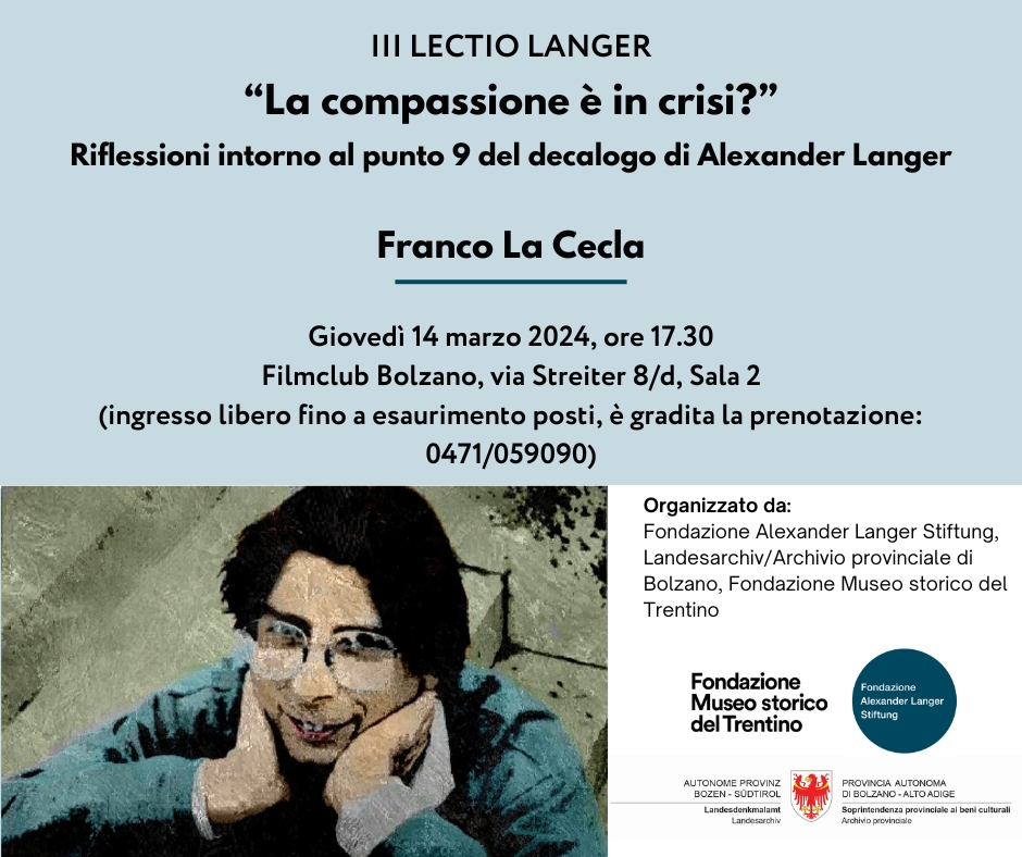La Fondazione Alexander Langer, l’Archivio provinciale di Bolzano e la Fondazione Museo storico del Trentino invitano la cittadinanza e gli interessati alla «Lectio Langer» che sarà tenuta da Franco La Cecla.