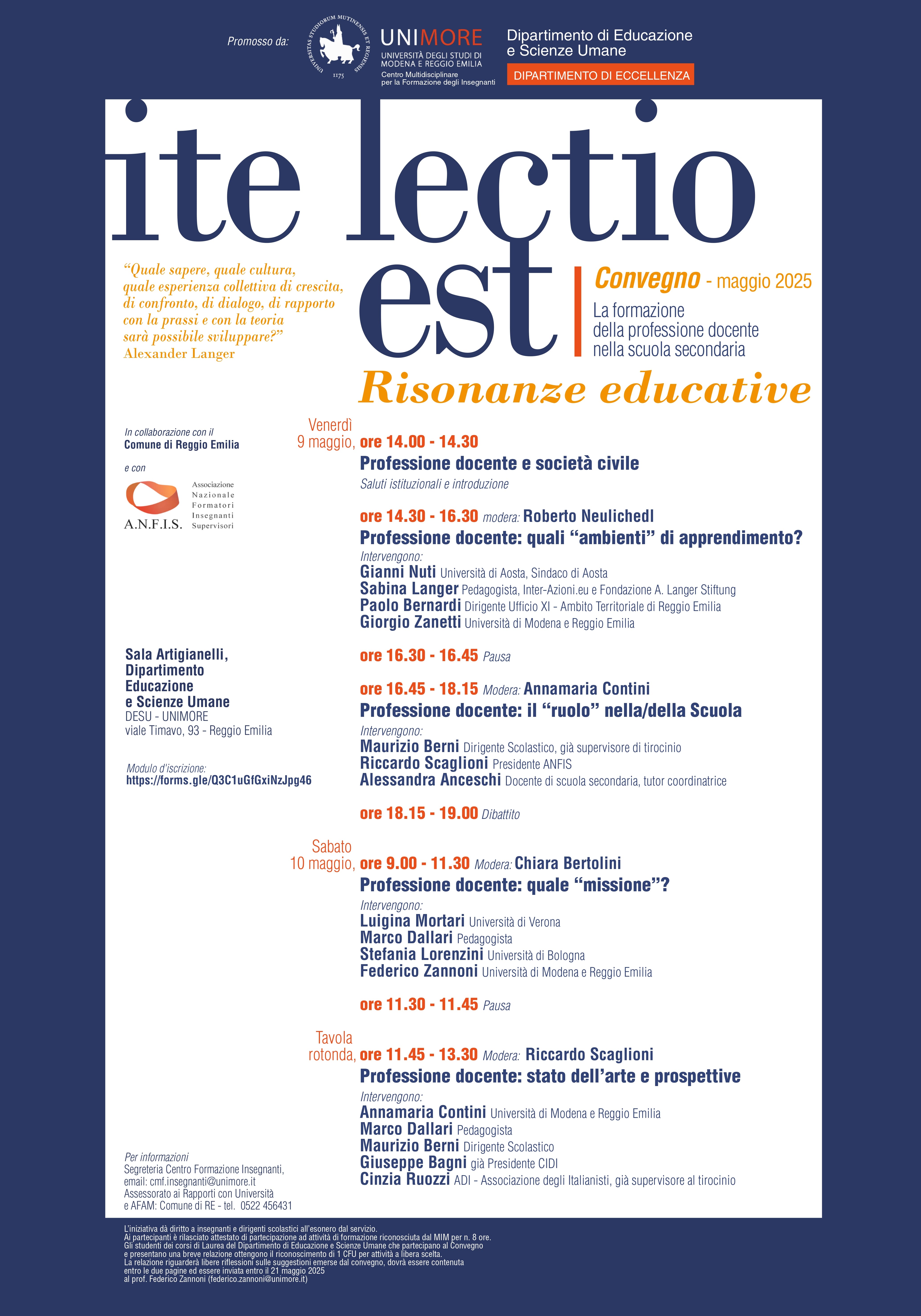 Il 9 e 10 maggio si terrà il convegno Ite lectio est presso l’Università degli Studi di Modena e Reggio-Emilia, dedicato alla formazione della professione docente nella scuola secondaria. Partendo dal paradigma ecologico, vuole essere anche un omaggio al pensiero pedagogico di Langer, intrecciando educazione, cittadinanza e etica politica.
